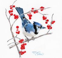 Beautifully framed and ready to gift, Blue Jay in Winterberries is an 8"x10" image drawn with colored pencil, double matted in dark navy and gray in a gorgeous dark blue/gray sculpted metal frame.